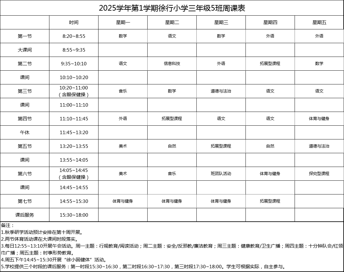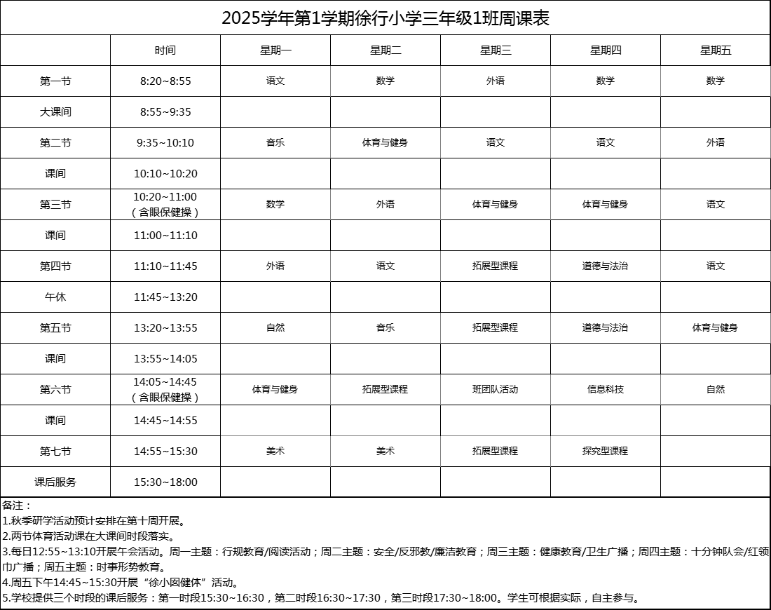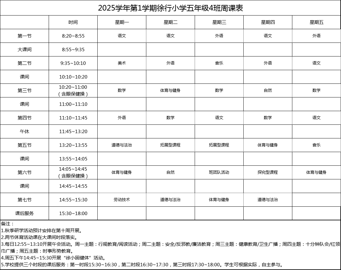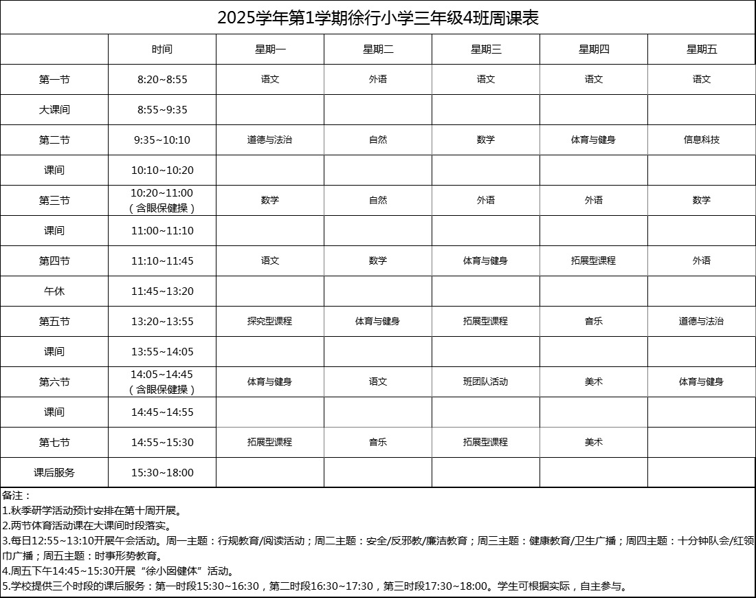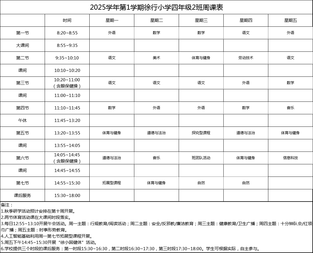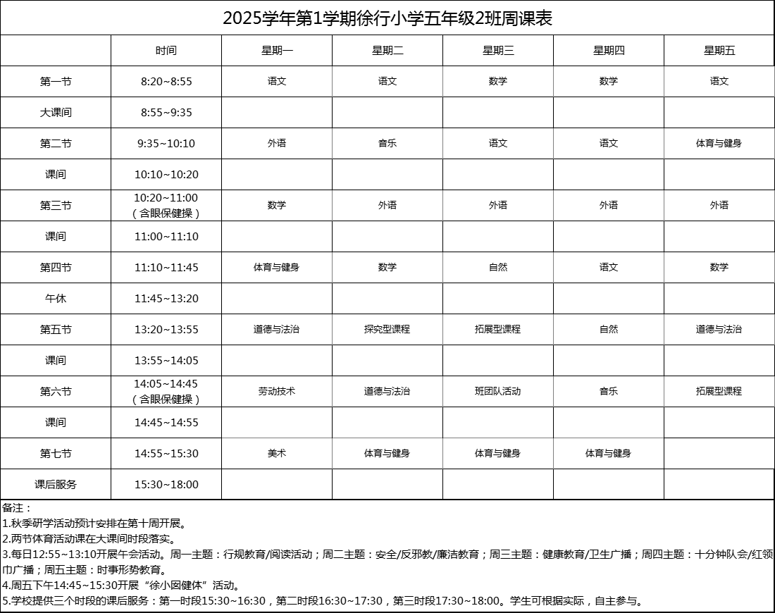 上海市嘉定区徐行小学2025学年度周课表