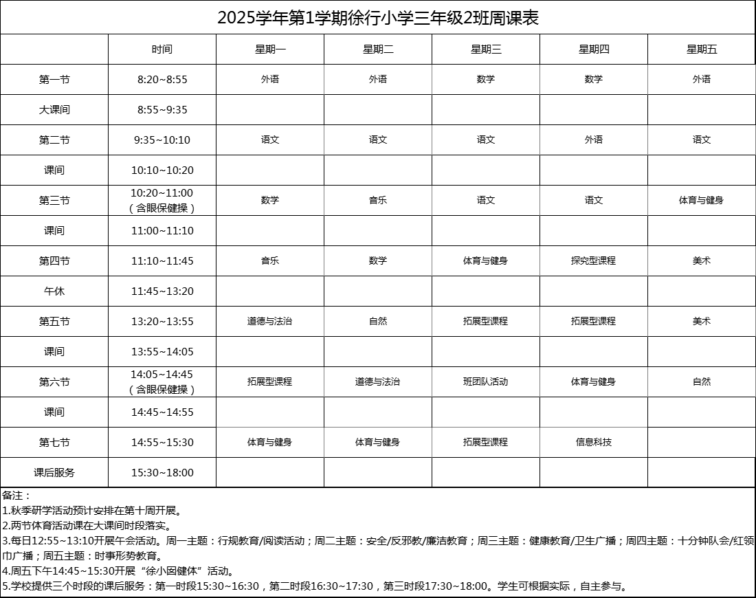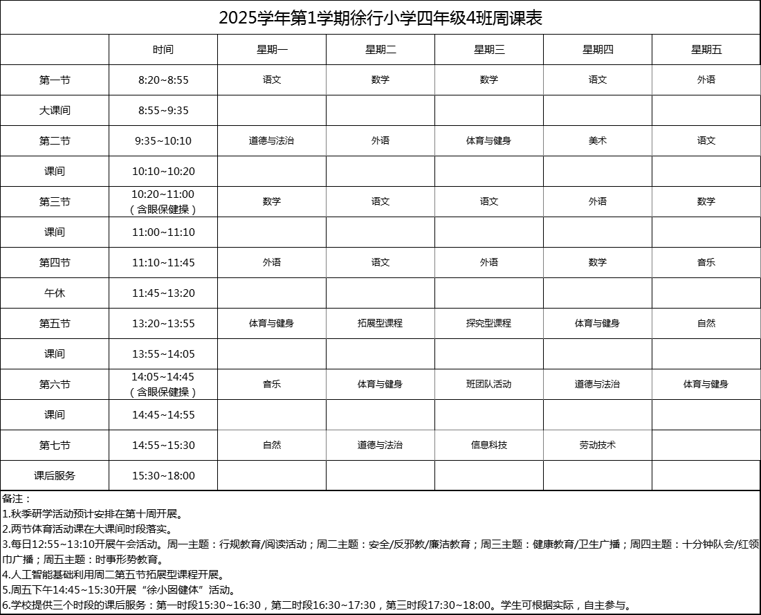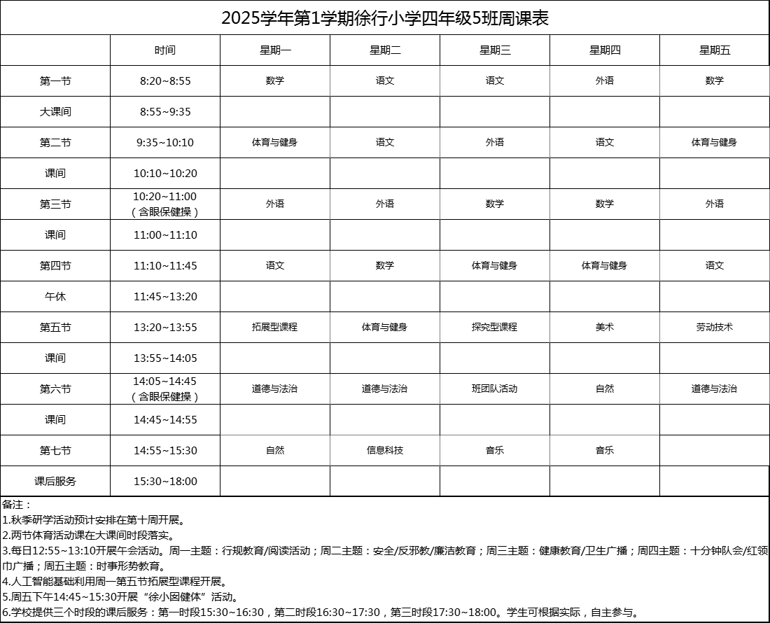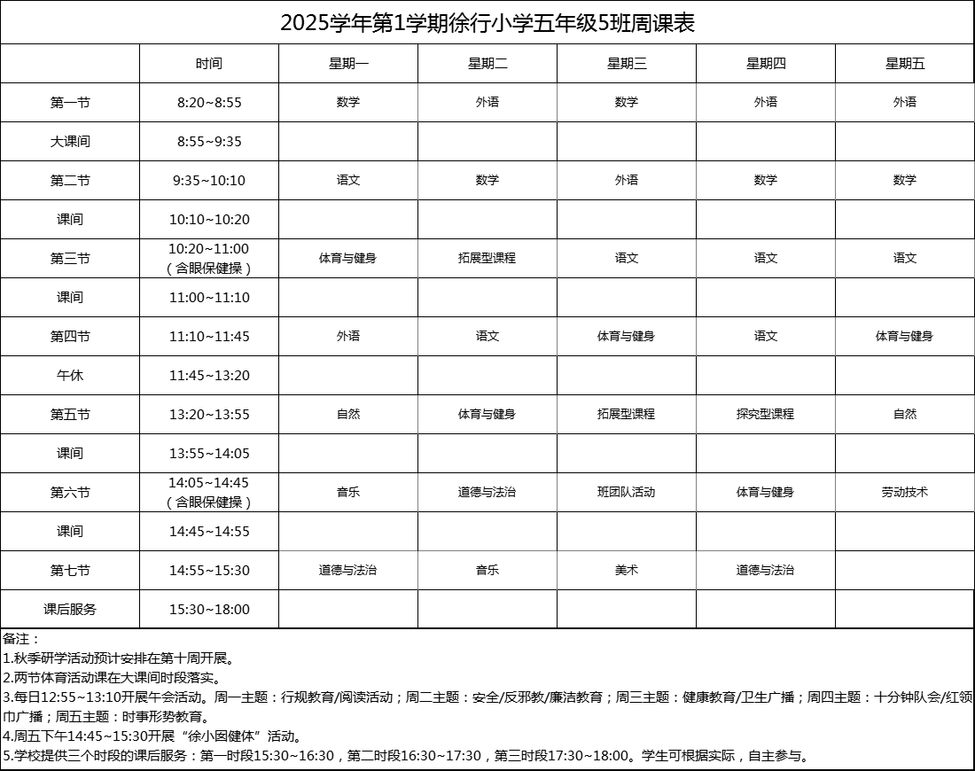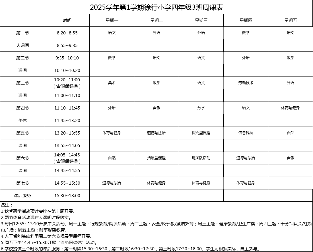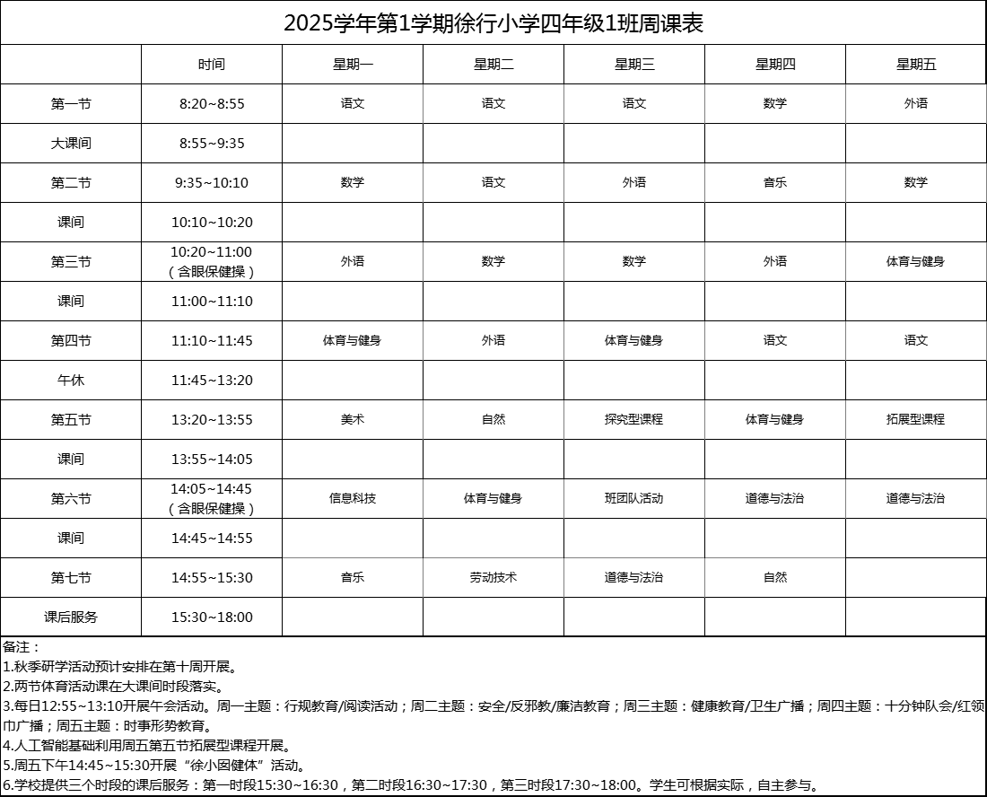 上海市嘉定区徐行小学2025学年度周课表