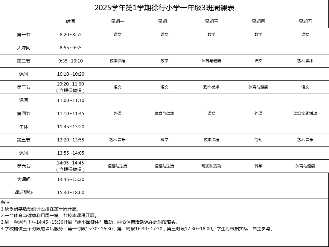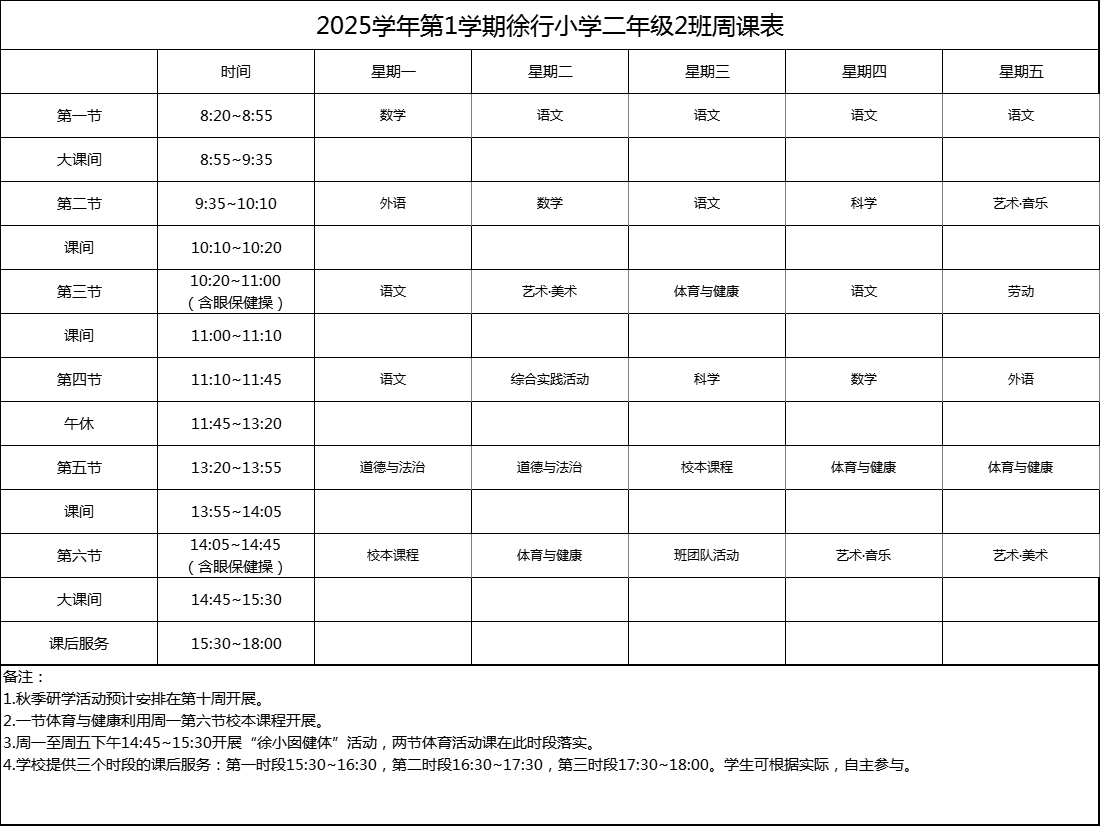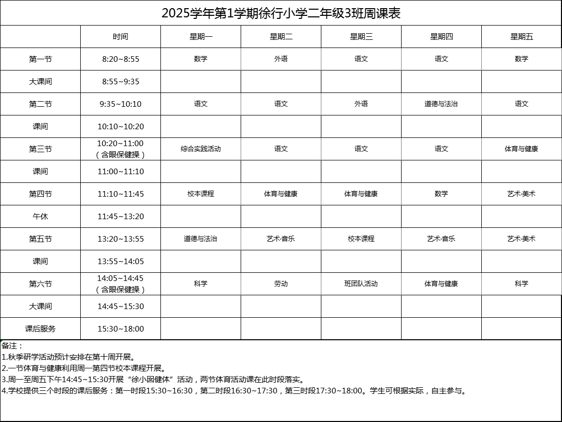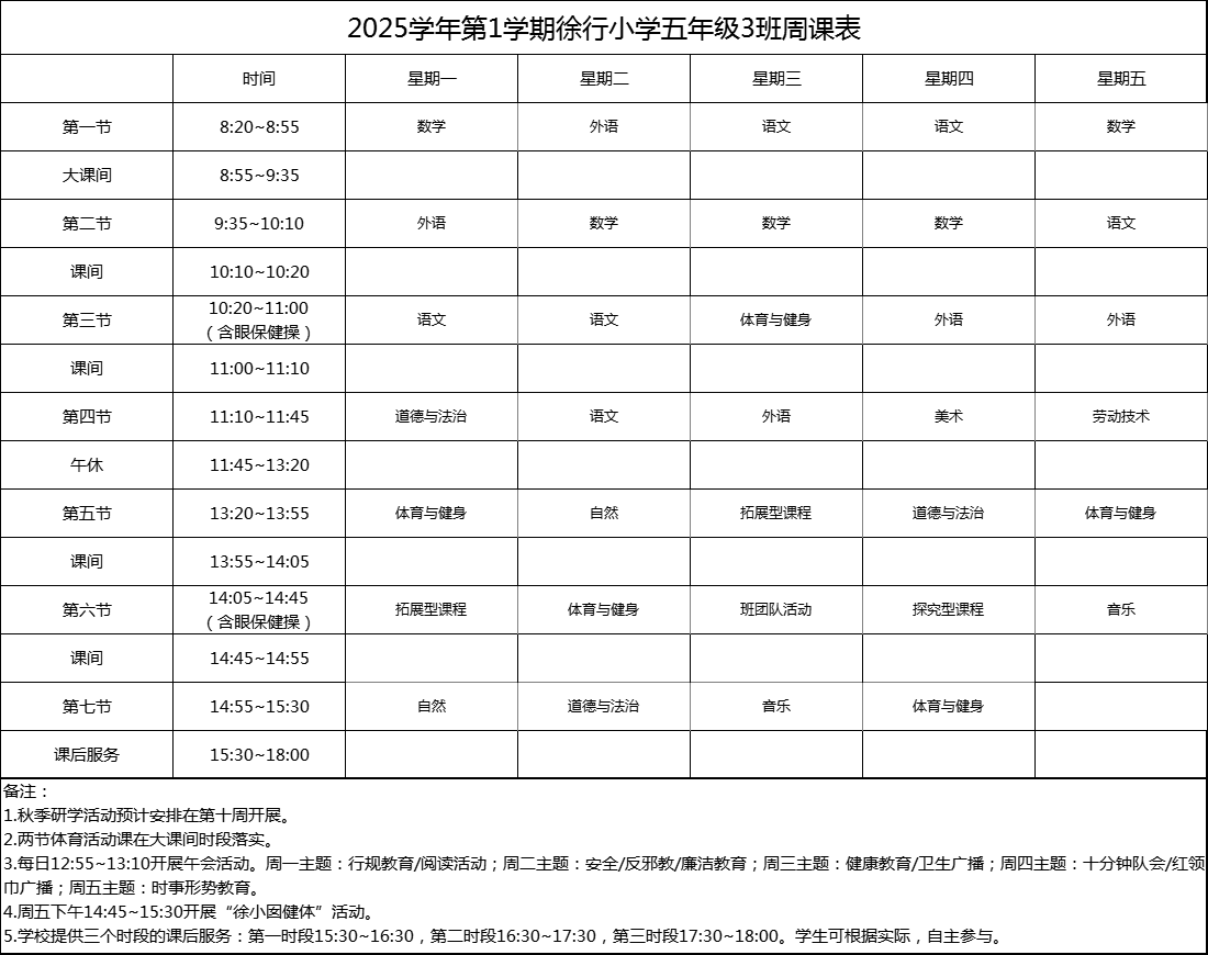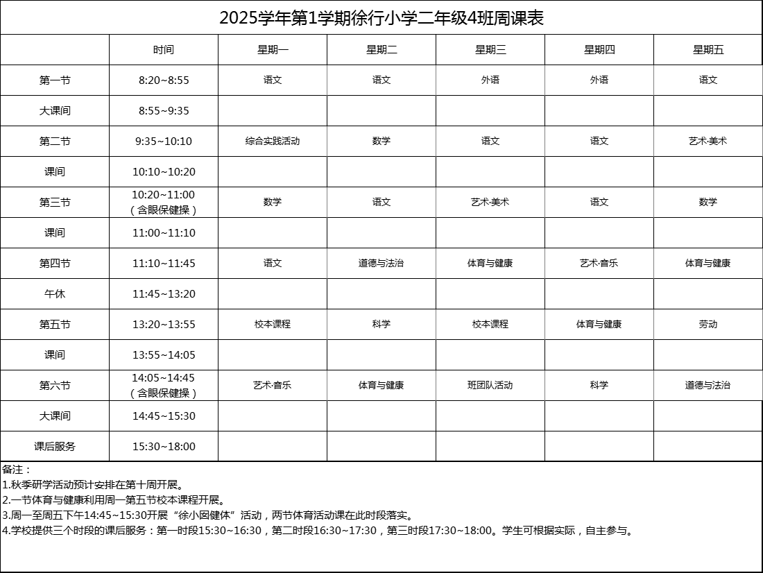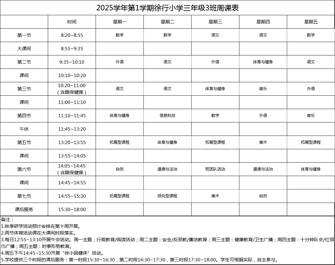 上海市嘉定区徐行小学2025学年度周课表