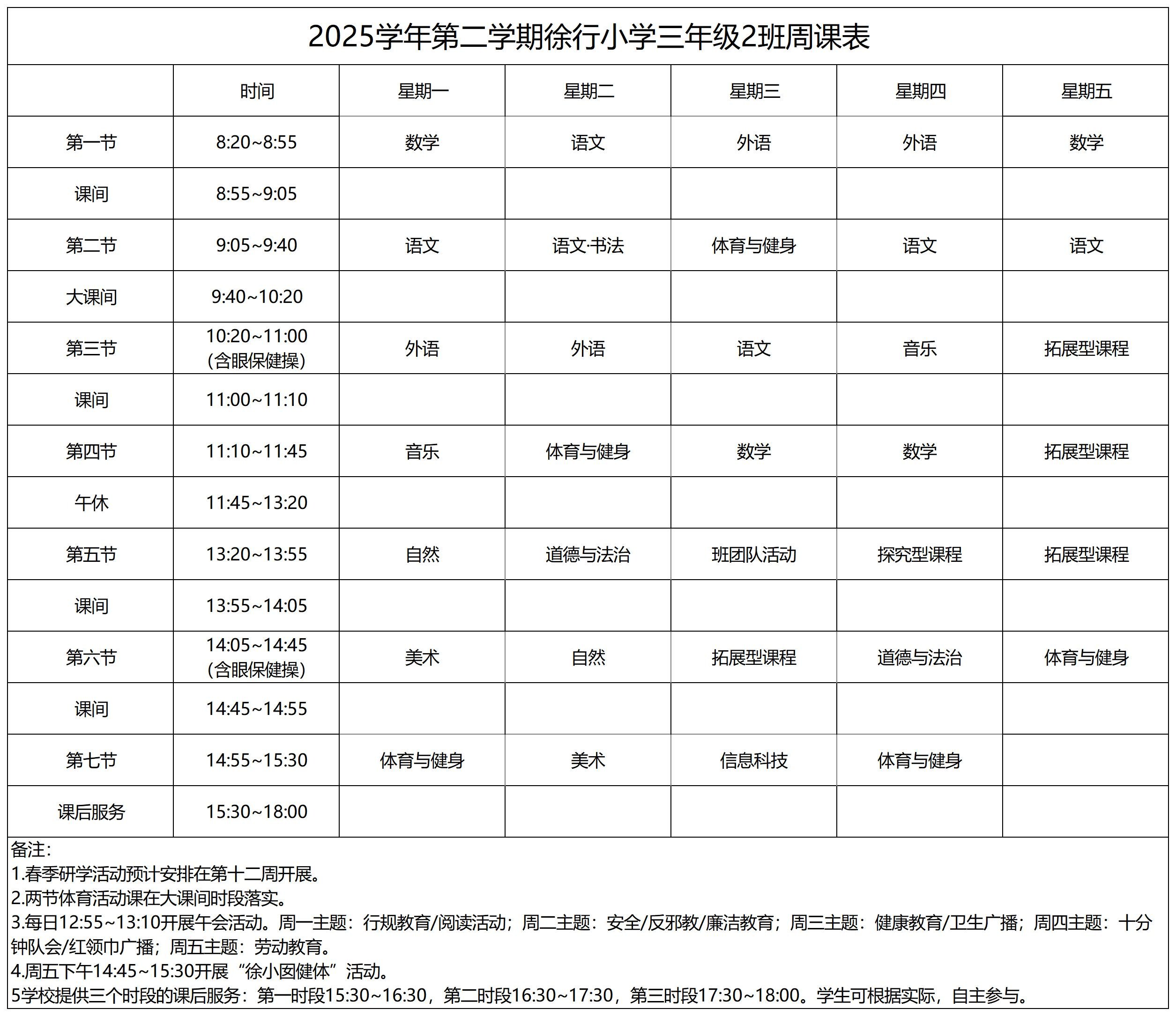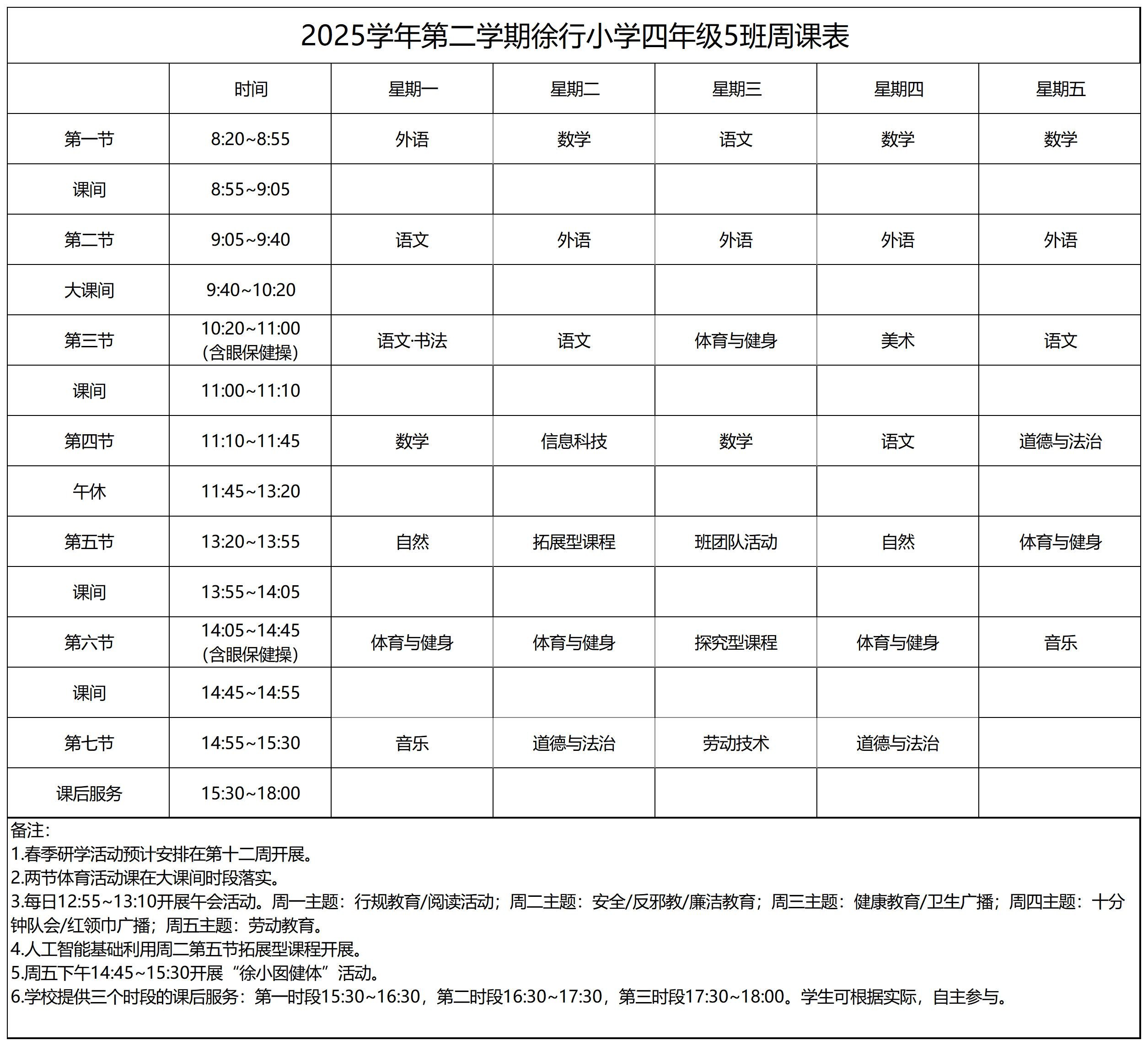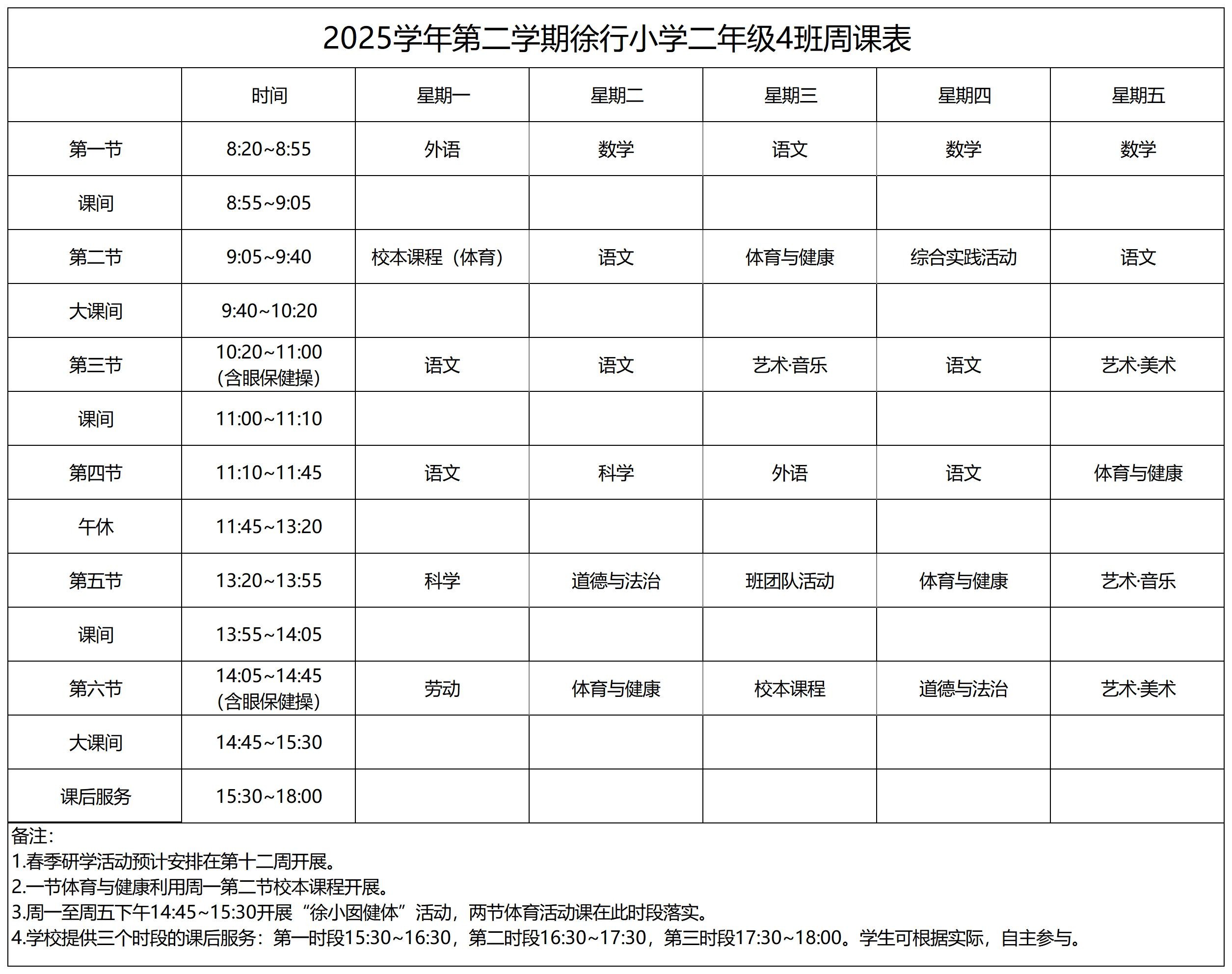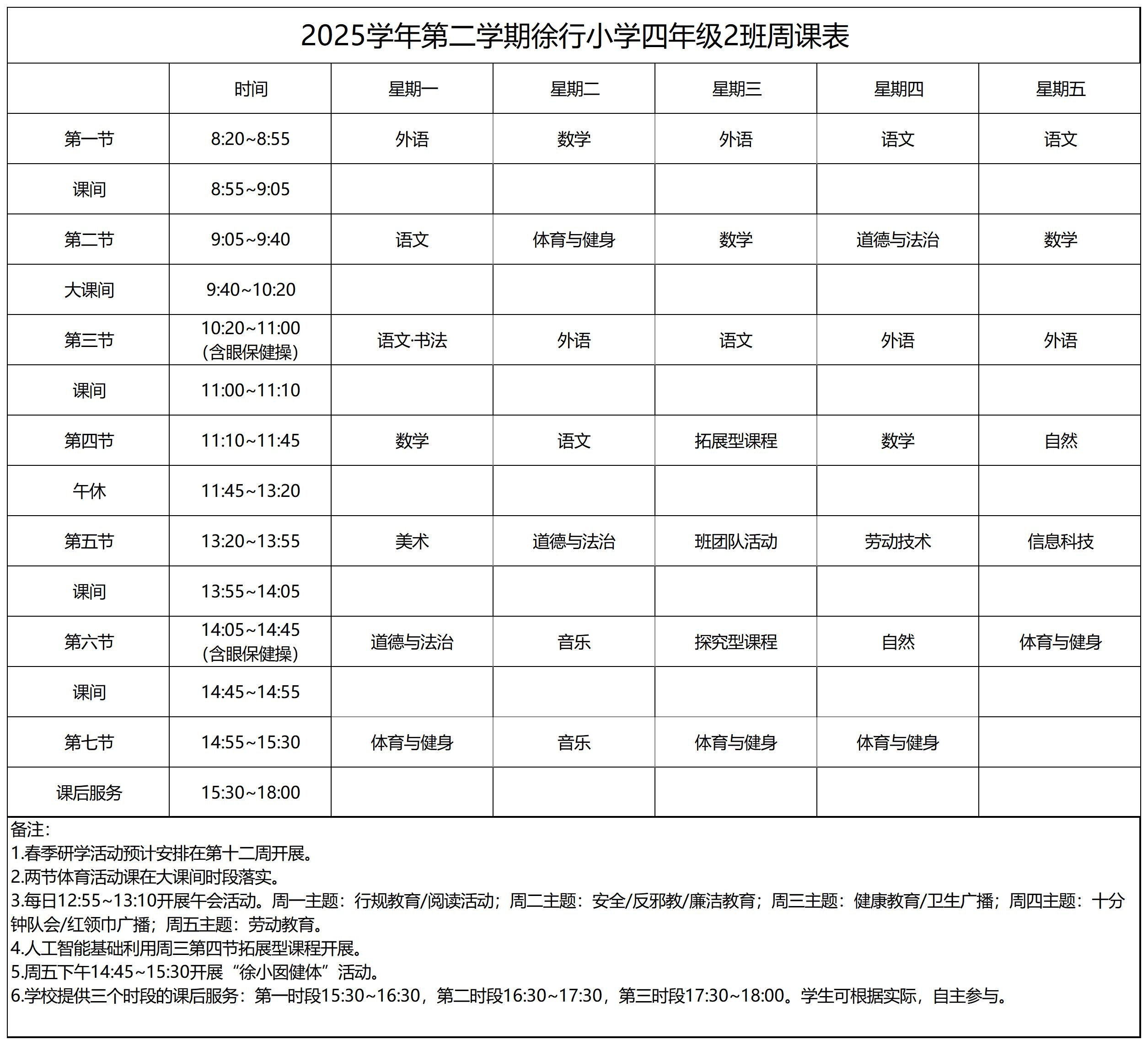 上海市嘉定区徐行小学2025学年第二学期周课表