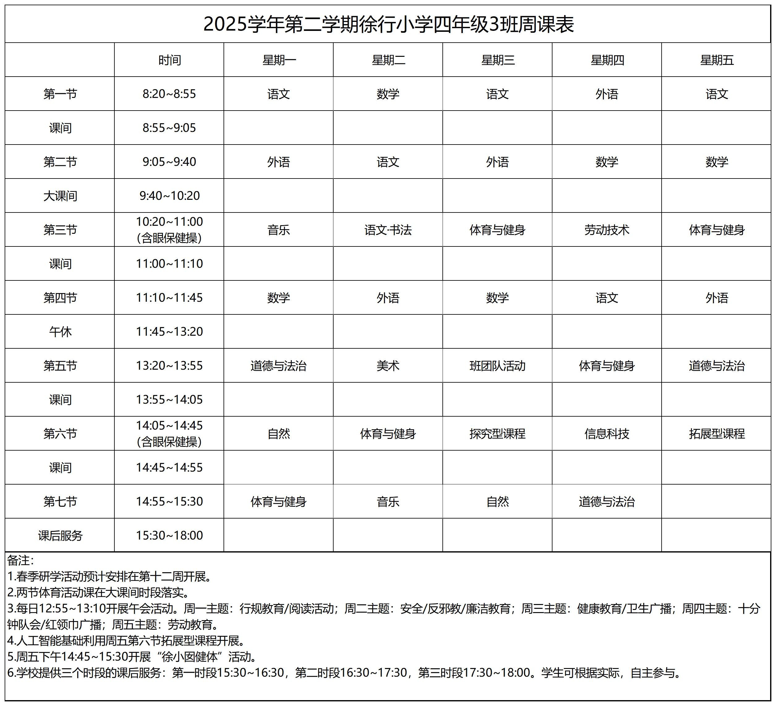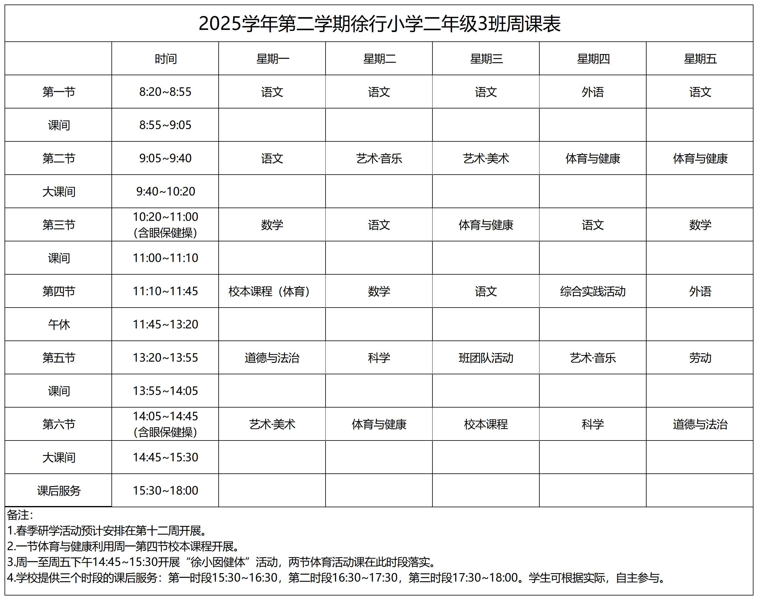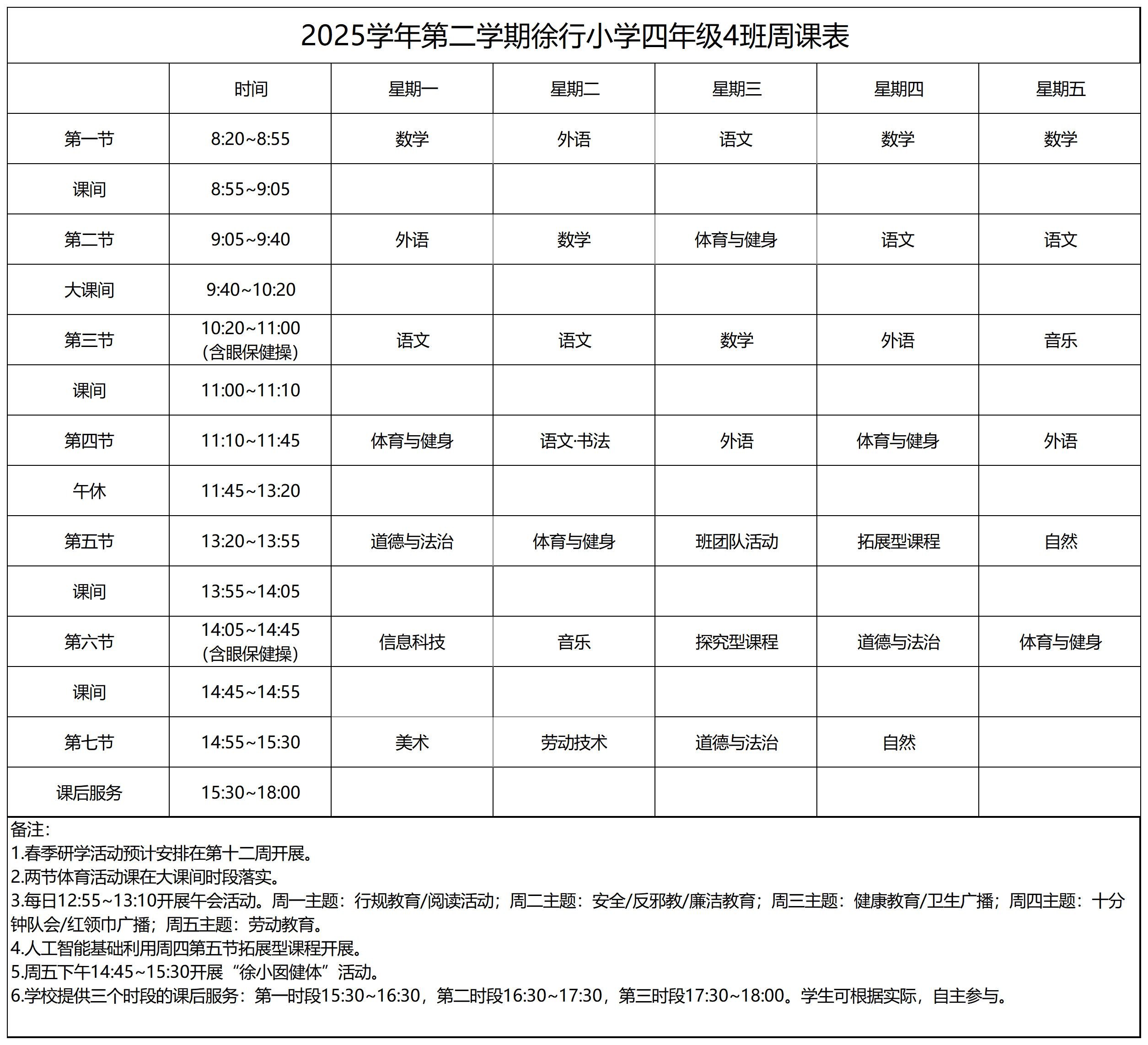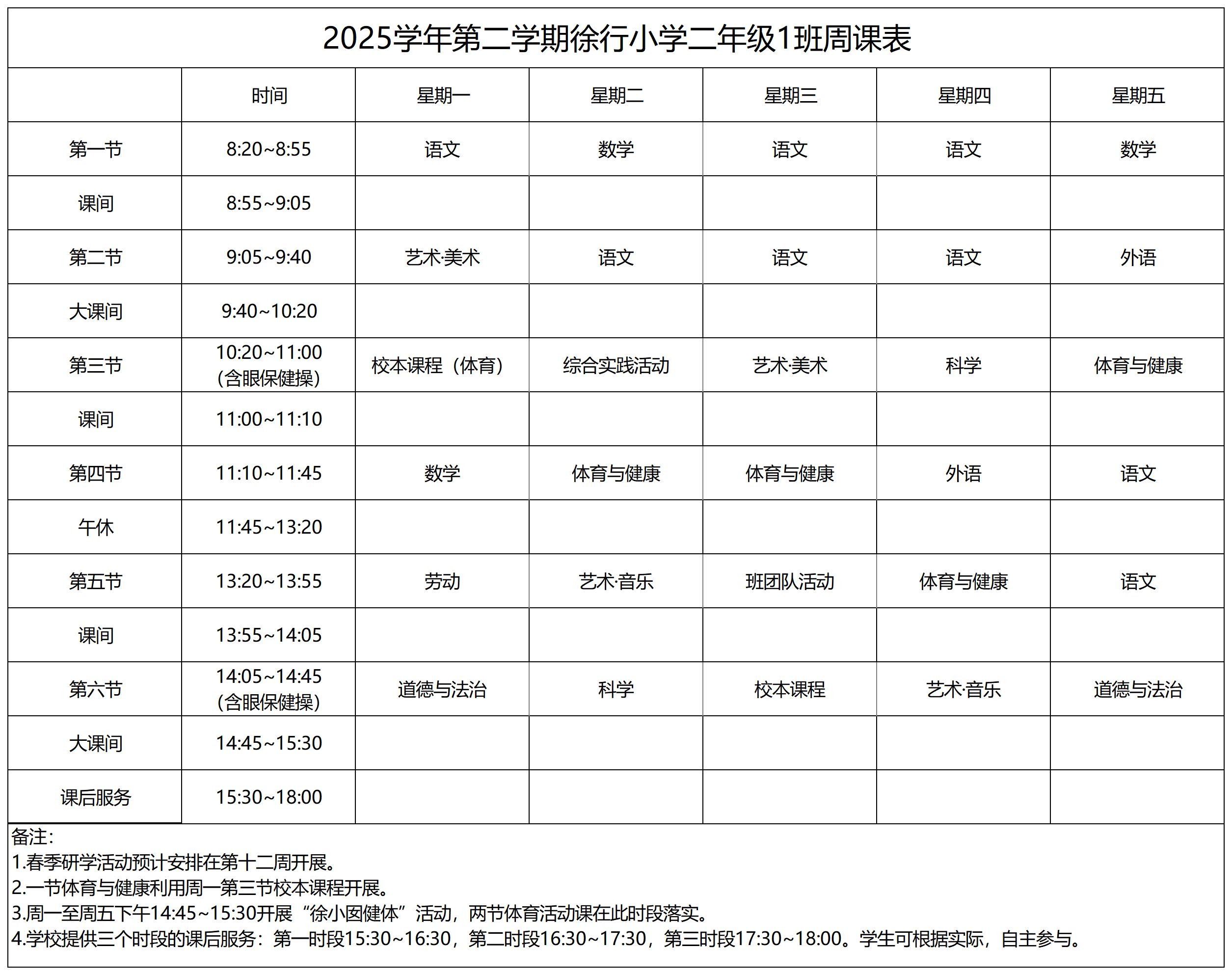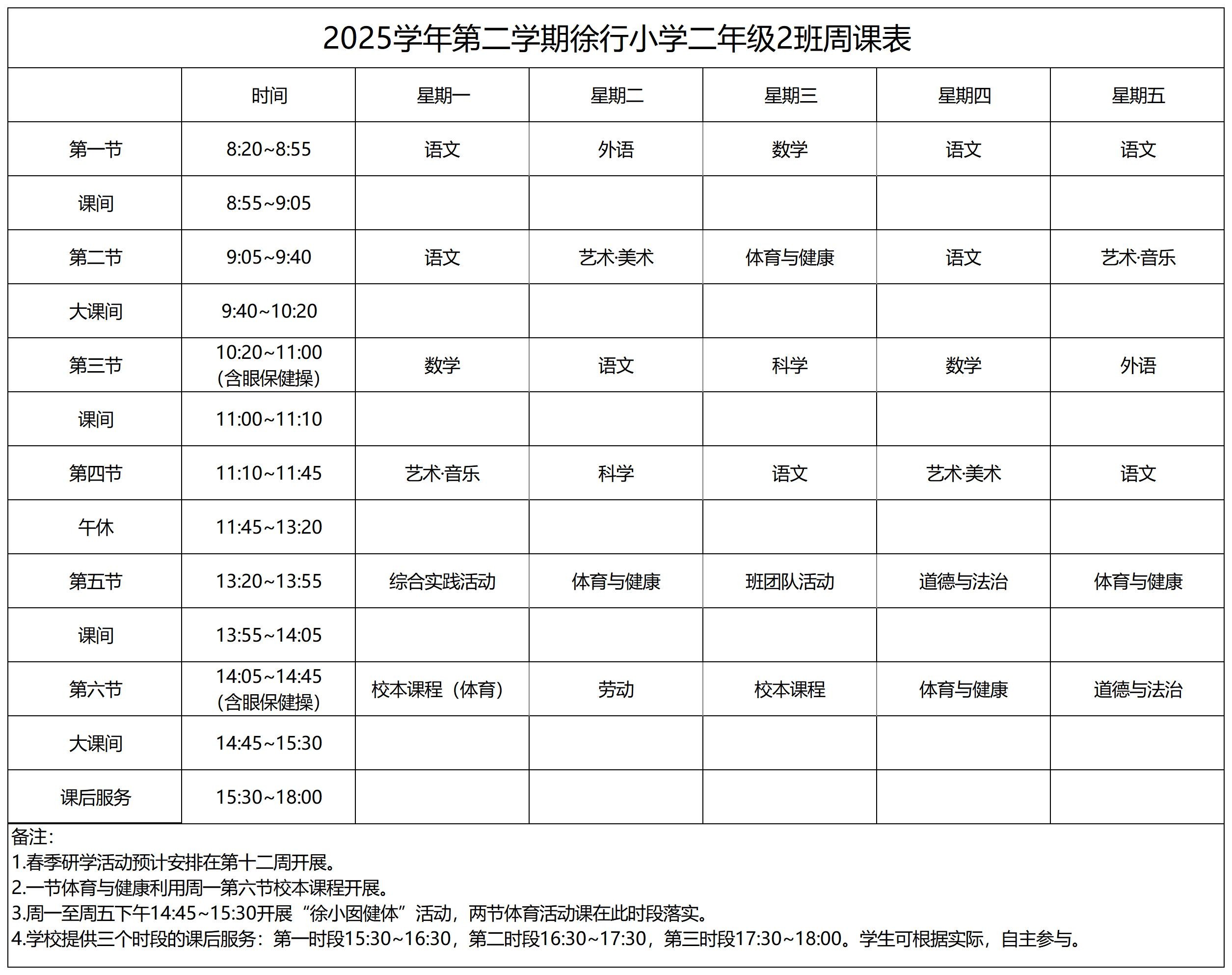 上海市嘉定区徐行小学2025学年第二学期周课表
