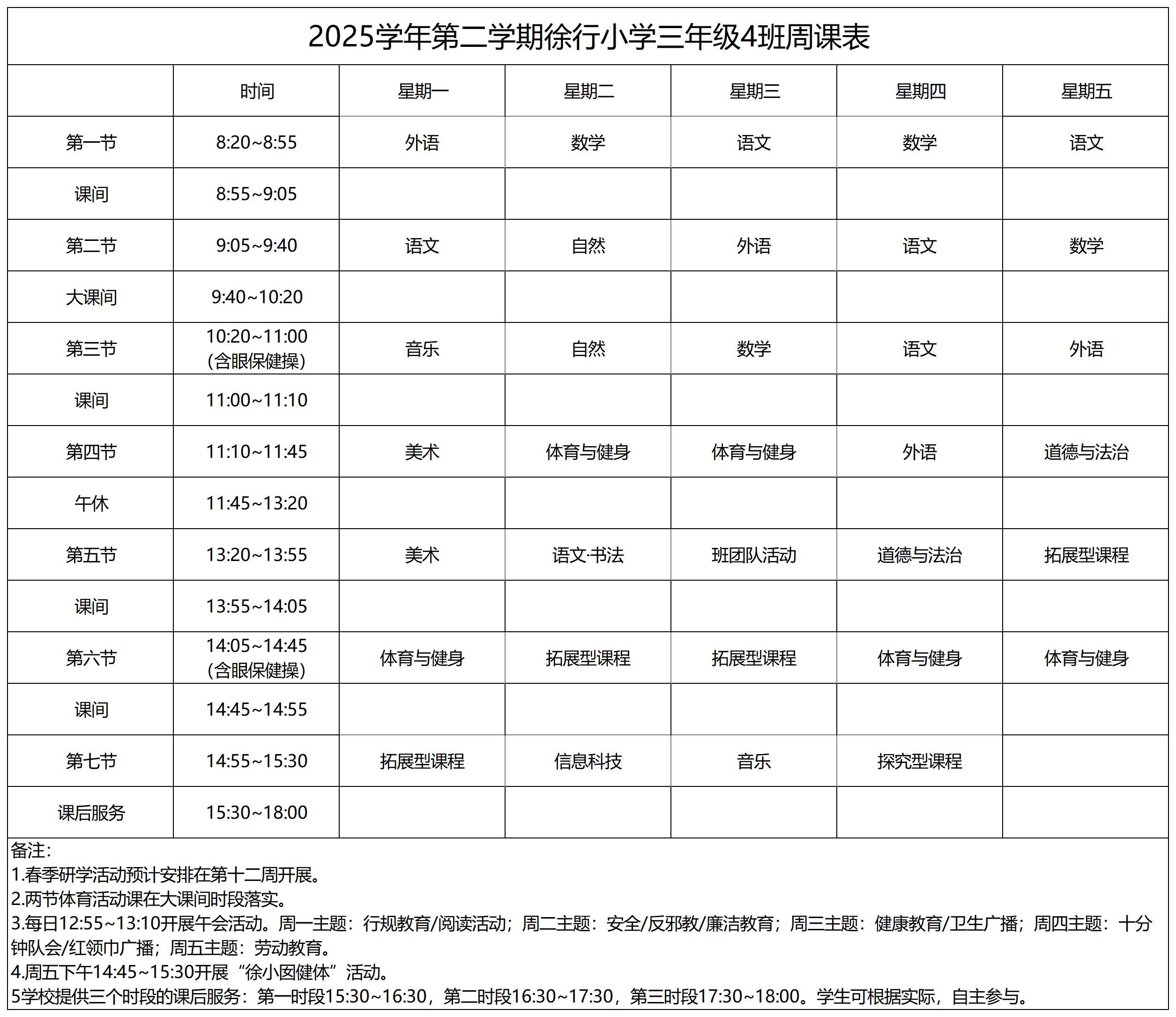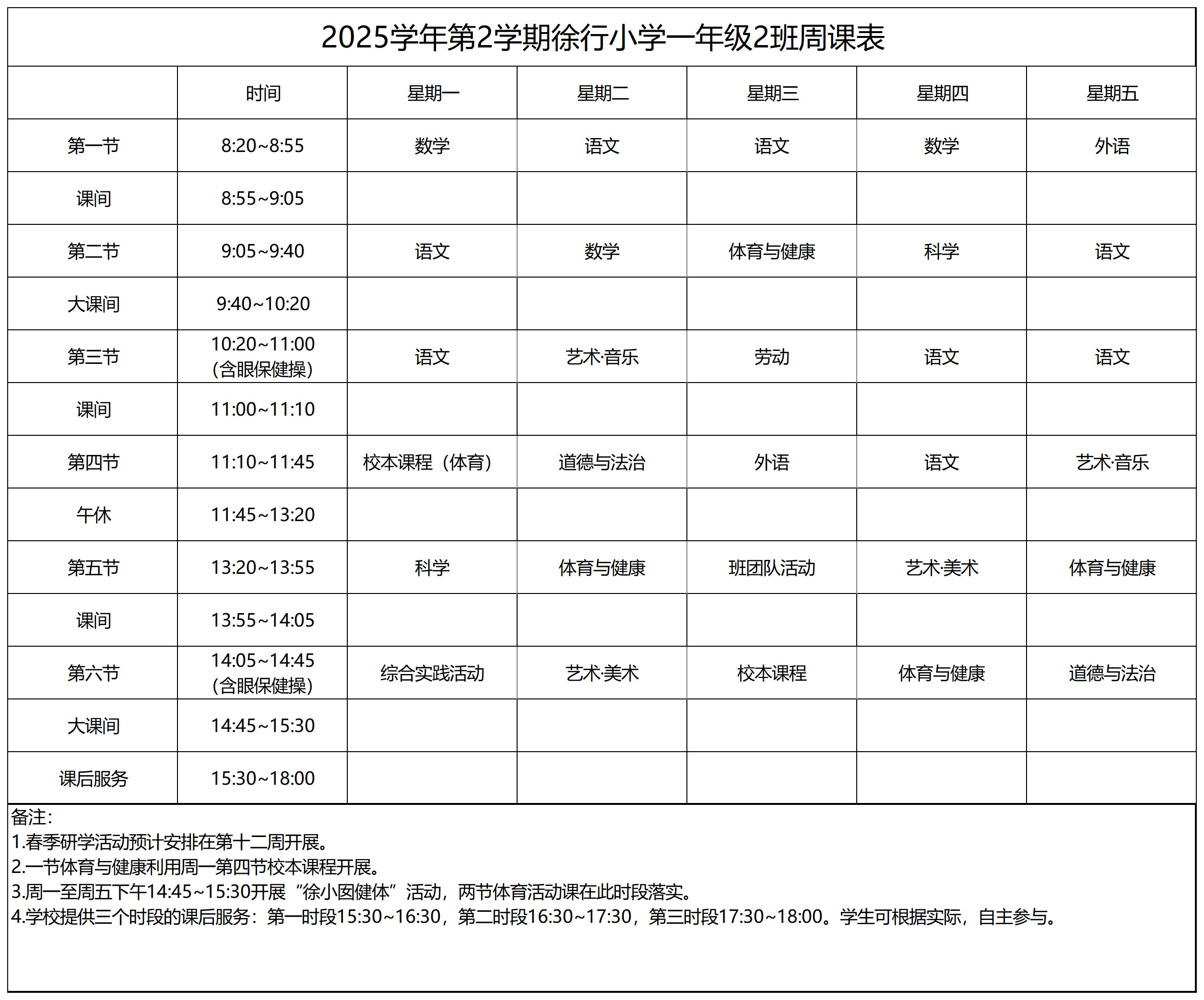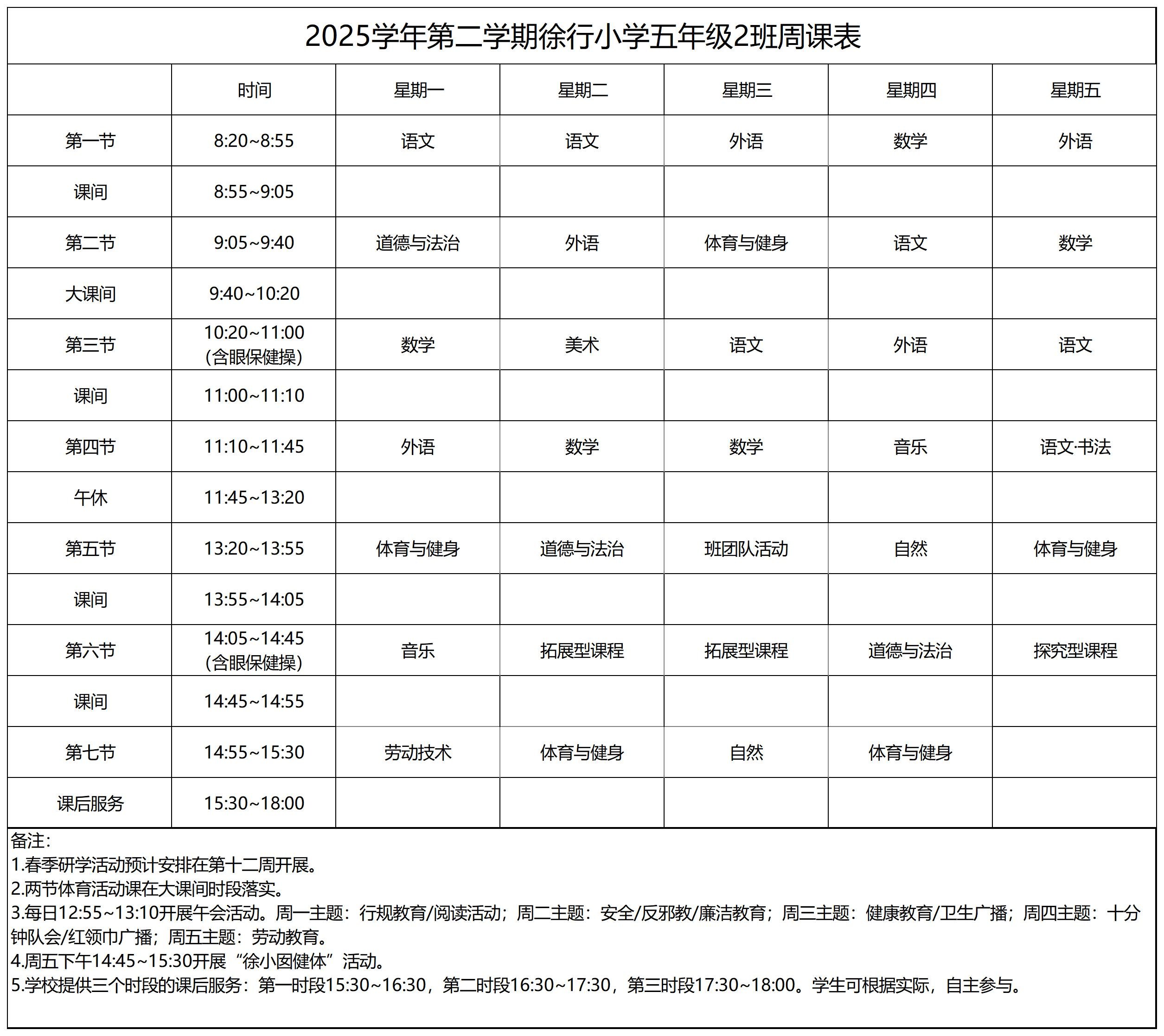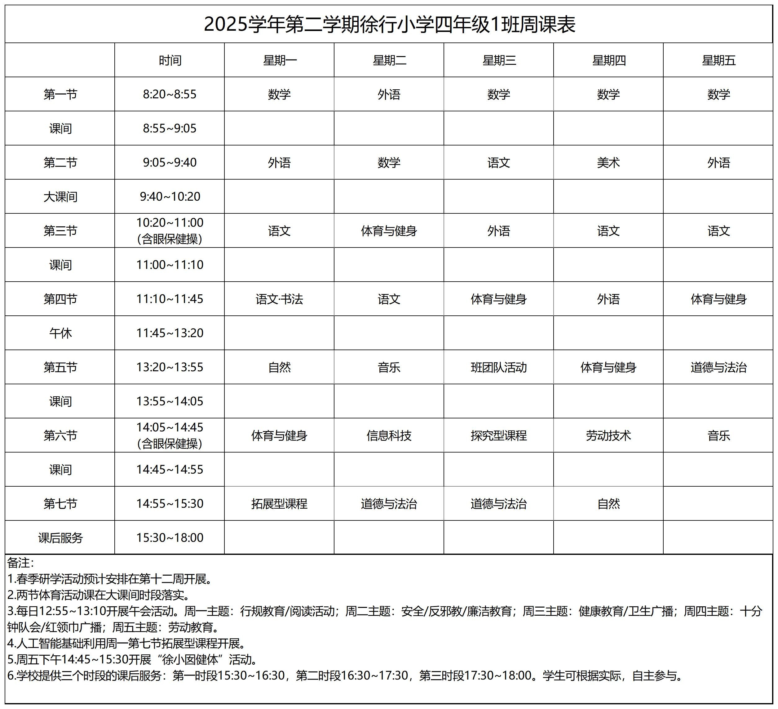 上海市嘉定区徐行小学2025学年第二学期周课表