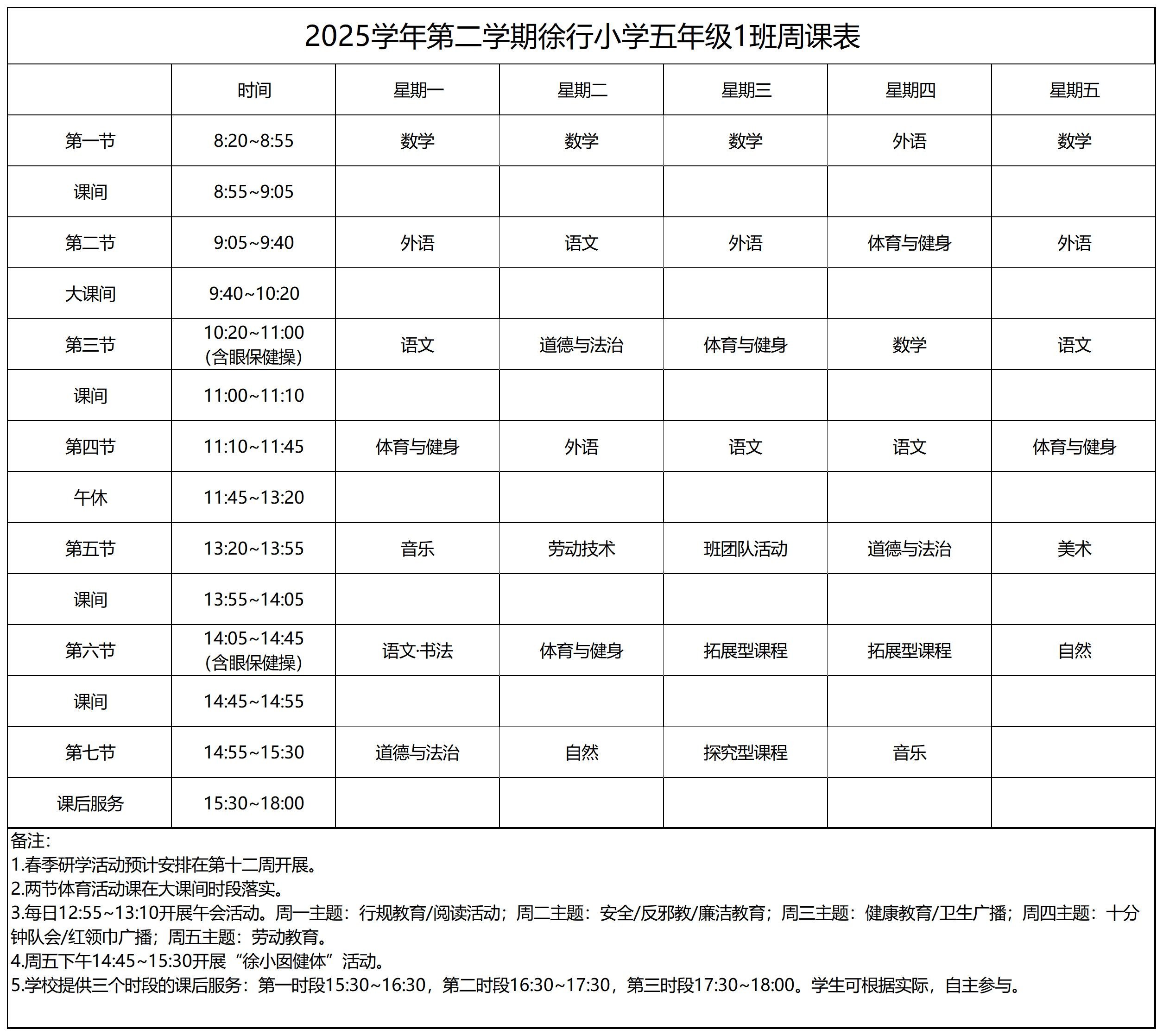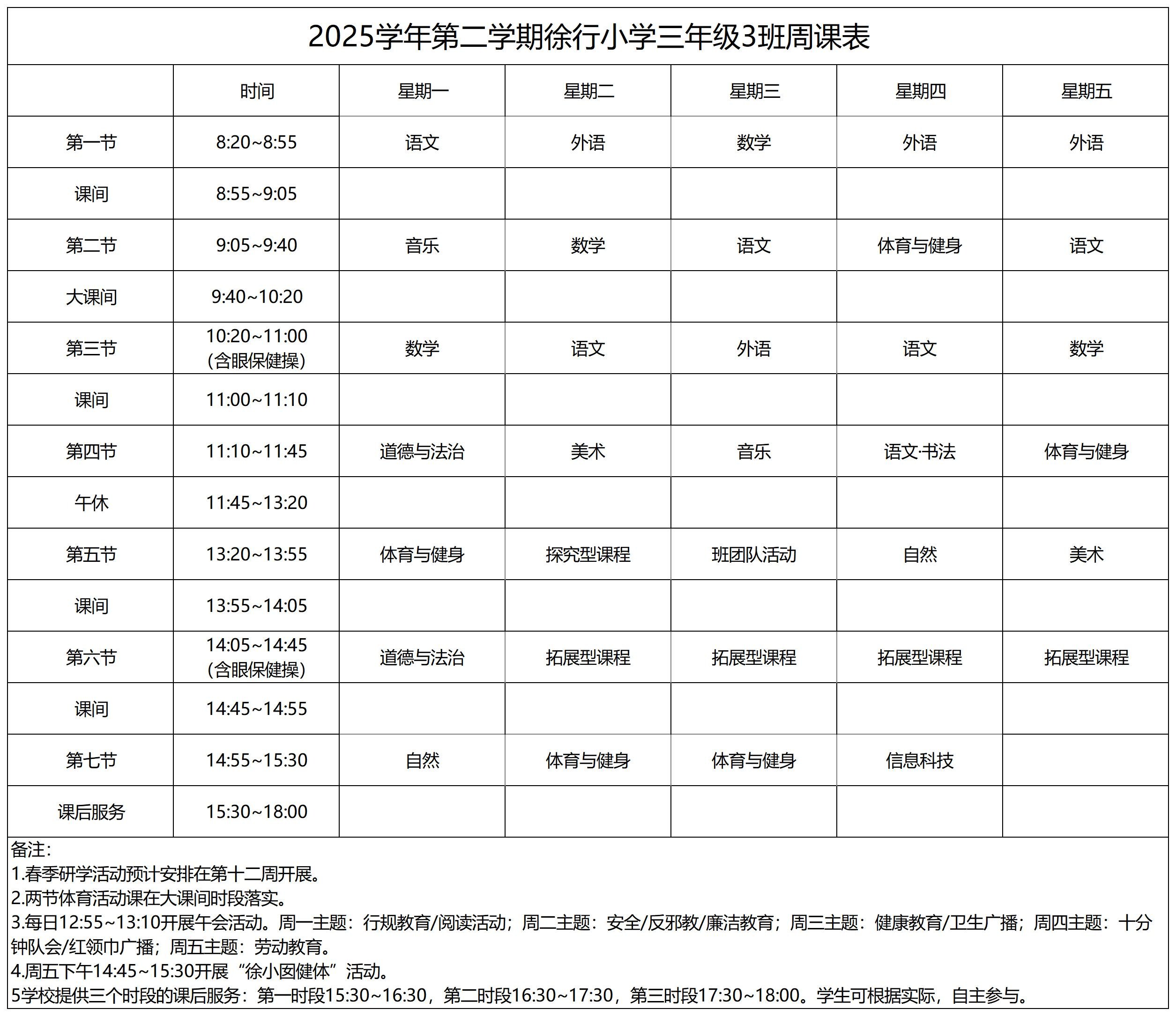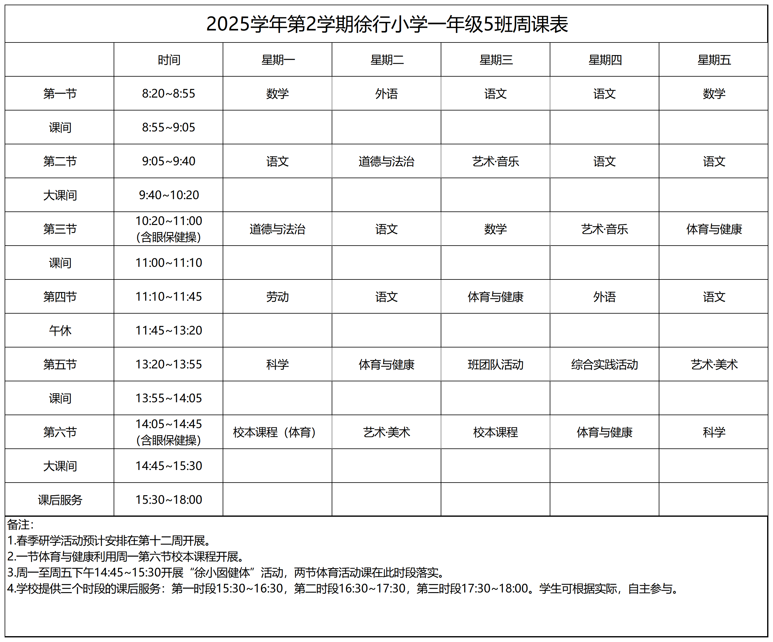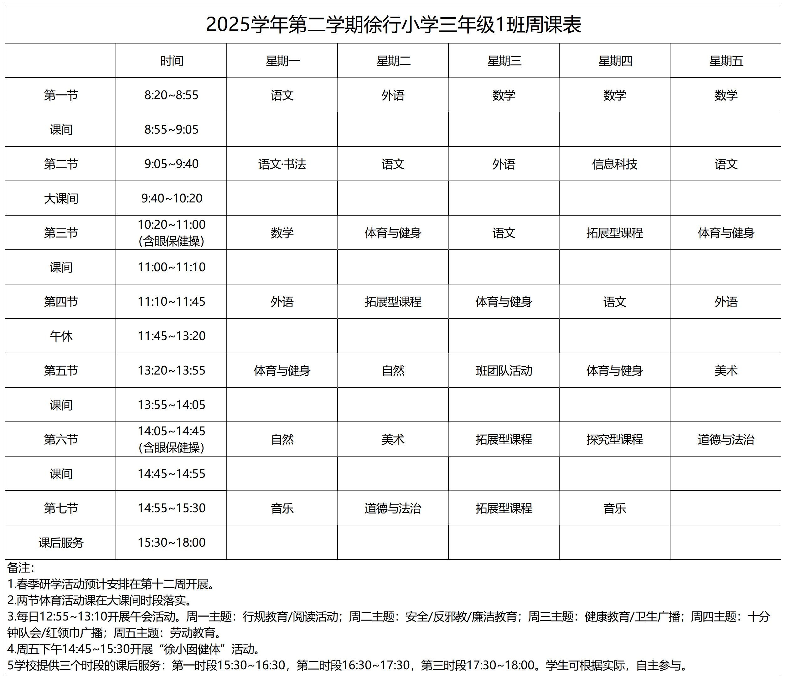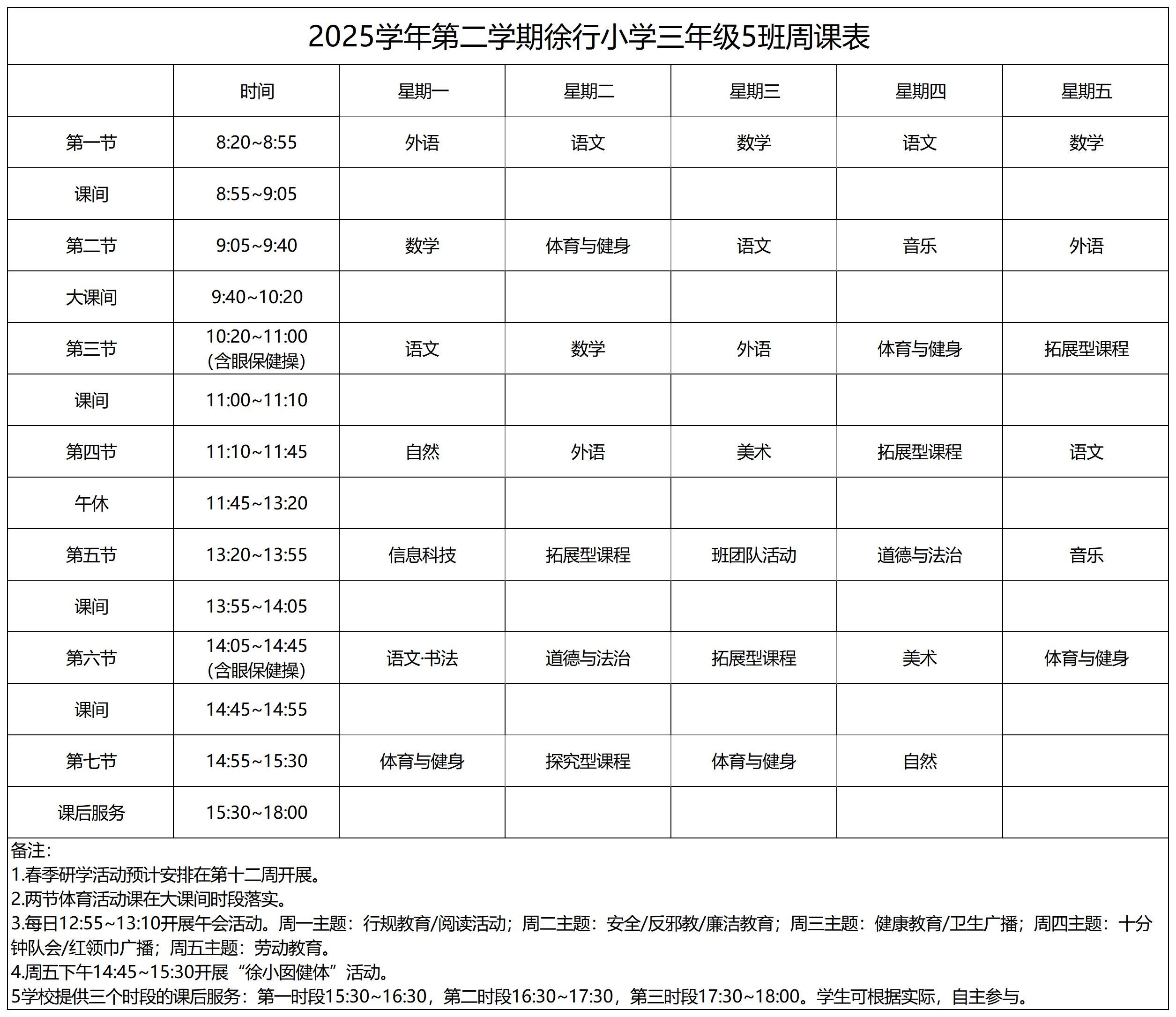 上海市嘉定区徐行小学2025学年第二学期周课表