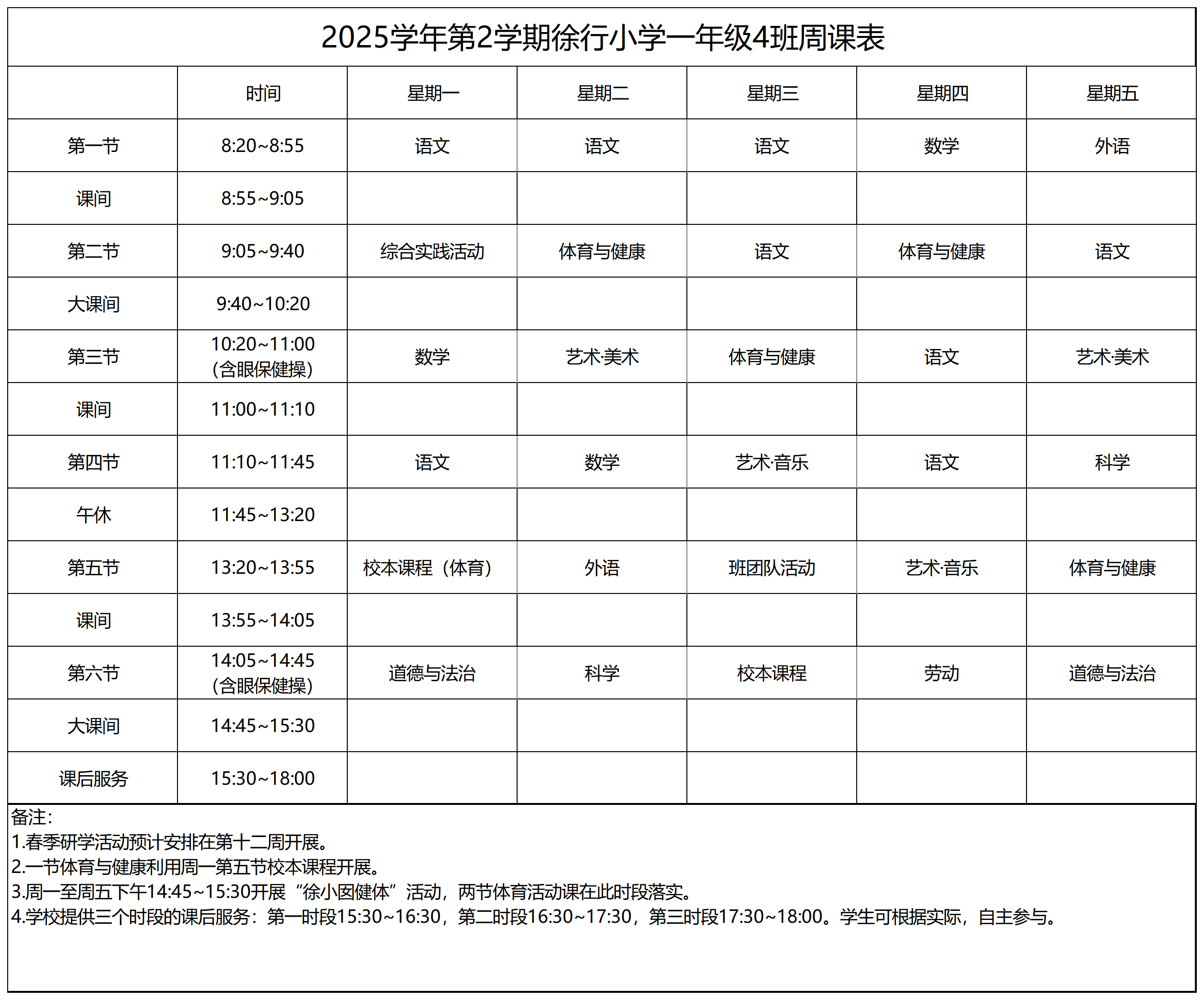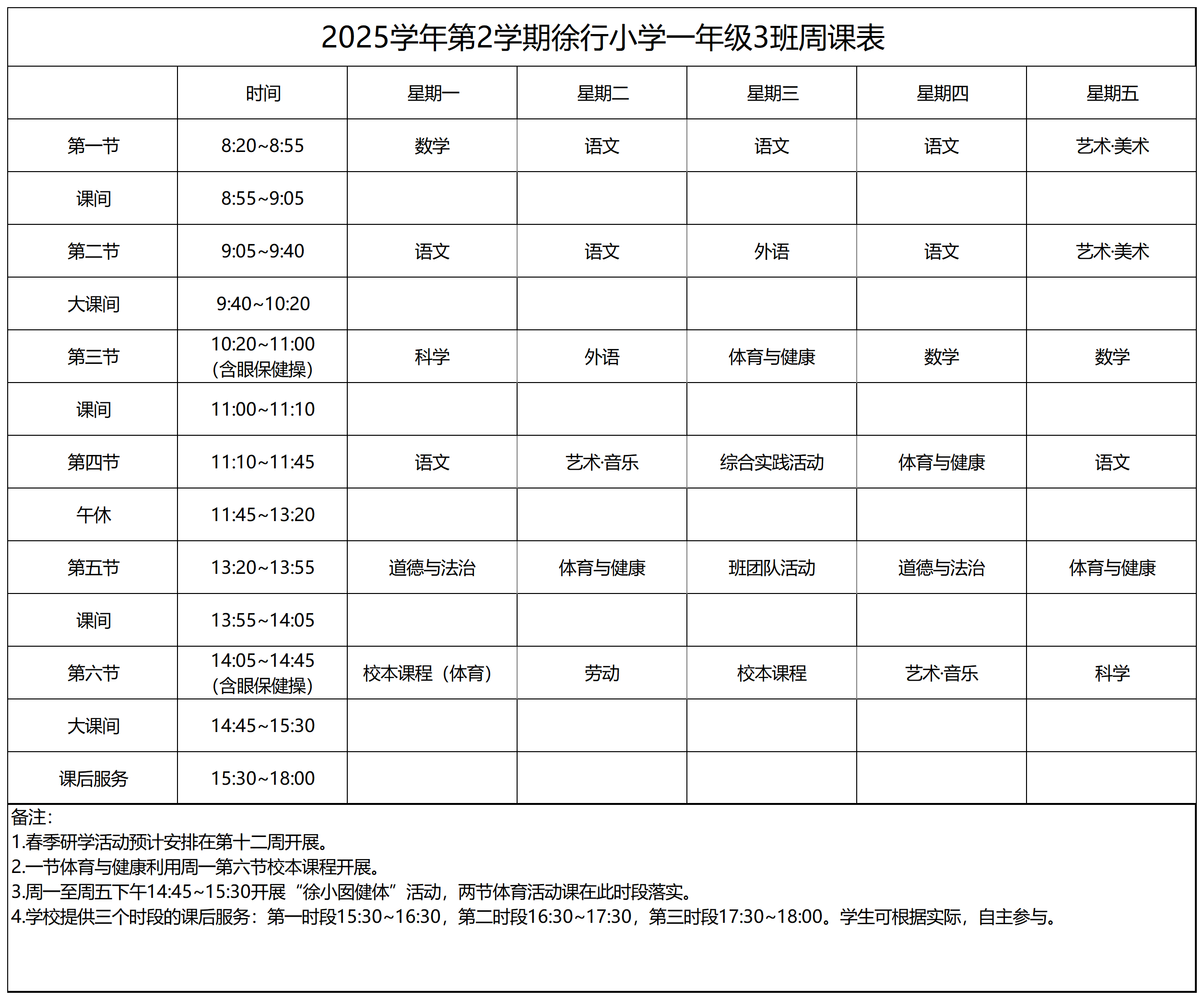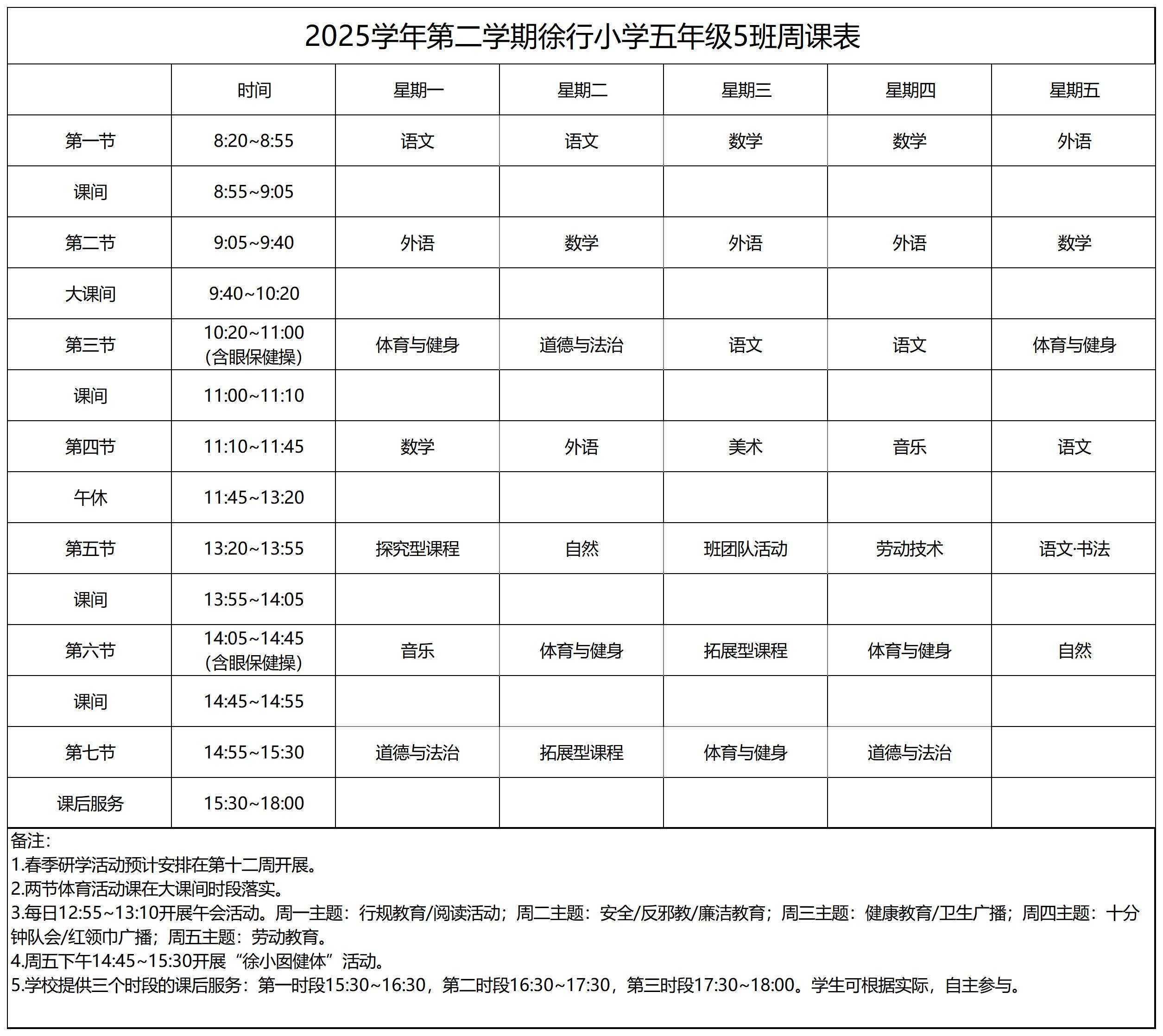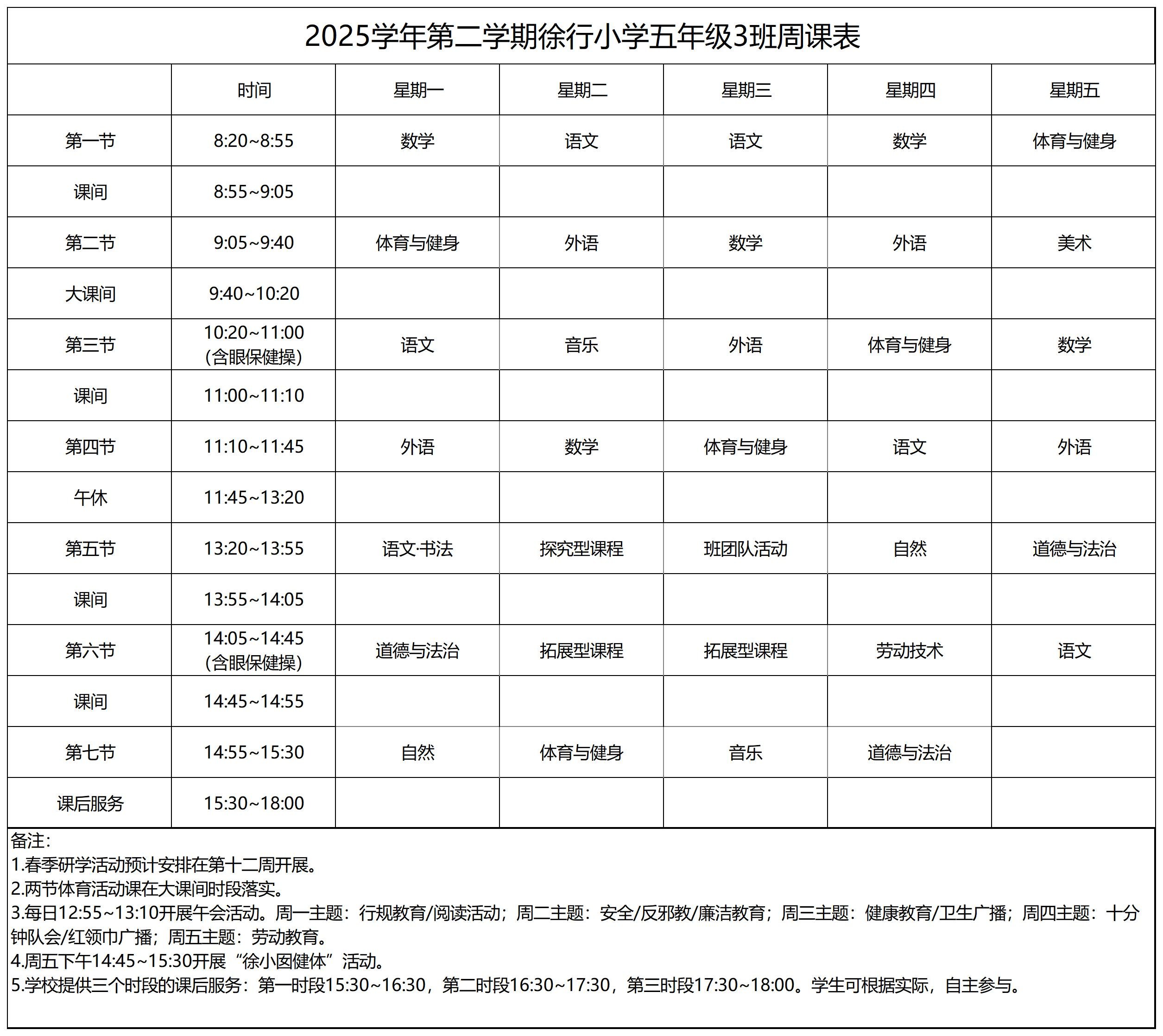 上海市嘉定区徐行小学2025学年第二学期周课表